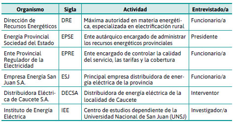 La metodología corresponde a una estrategia cualitativa que incluye la realización de entrevistas en profundidad de carácter semiestructuradas, en las cuales los informantes clave han sido: funcionarios de la administración pública y el ente regulador, autoridades de las empresas distribuidoras y la empresa energética provincial, e investigadores de la unsj vinculados al sector eléctrico y energético (ver Tabla 1). Para este nivel de indagación, se comprenden las técnicas propias del método etnográfico (Guber, 2001), como instrumentos que permiten intervenir en esta empiria. La sistematización de las entrevistas, a su vez, fue complementada con técnicas de análisis documental y la revisión de fuentes secundarias (bibliografía especializada, informes, leyes, decretos, estadísticas, etc.). El artículo procura, en suma, precisar las diferentes visiones de la cuestión energética en San Juan, contribuyendo a una investigación más amplia, la cual busca abordar diferentes experiencias y proyectos subnacionales en torno a la transición energética.