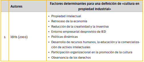 Idris, a pesar de no definir con precisión el término «cultura en propiedad industrial», es uno de los autores que ha utilizado factores determinantes para brindar una definición del mismo. De forma implícita aparecen determinantes como adopción de políticas dinámicas, desarrollo de recursos humanos, educación y comercialización de activos intelectuales, participación de organizaciones en la gestión de la cultura en propiedad industrial; de manera implícita, pone de manifiesto el proceso de normas asociadas a la protección de la creatividad intelectual y la necesaria relación universidad-empresa en la gestión de la cultura en propiedad industrial.