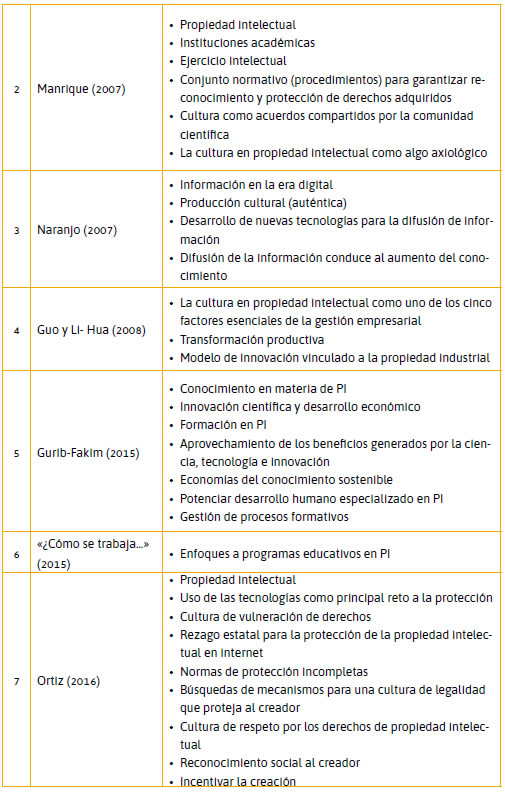 El acercamiento bibliográfico realizado creó las condiciones para identificar aquellos factores más utilizados por los autores estudiados al momento de brindar un concepto de «cultura en propiedad industrial». La identificación de estos factores se ejecutó a través de un grupo de expertos y aplicando técnicas de generación de ideas, cuyo resultado inicial fue validado con la revisión crítica de las obras seleccionadas de los autores mencionados.