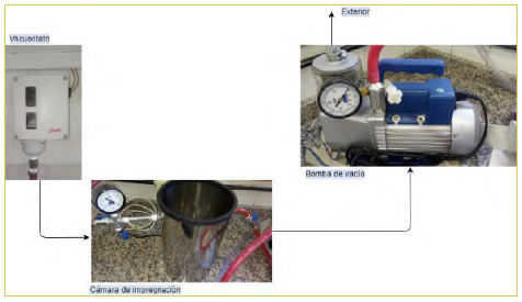 Consta de una cámara de impregnación, un vacuostato y una bomba de vacío (Fig. 1). La cámara de impregnación consiste en un recipiente cilíndrico de acero inoxidable, con dos conexiones, una para el sensor del vacuostato y otro para la conexión con la bomba. El borde superior cuenta con o’ring que amplía la superficie de apoyo de la tapa de cristal de 10 mm, creando un cierre hermético y asegurando el vacío dentro de la cámara. Los equipos están interconectados por medio de mangueras malladas aptas para soportar alto vacío, reforzadas con abrazaderas en los acoples.