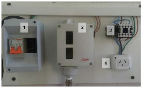 Como muestra la Figura 2, fue montado sobre un tablero confeccionado por el equipo de trabajo. Consta de los siguientes instrumentos: llave termomagnética bipolar (1), tiene como función proteger el circuito ante eventuales sobrecargas y cortocircuitos, además de poseer un control independiente a la presión de vacío. El vacuostato (2), elemento de control que posee una parte eléctrica y otra de sensado. La parte eléctrica se conecta con el circuito de alimentación y con un contactor (3). Con ayuda del visor que posee en el frente, se selecciona el valor de presión de vacío deseado. Una vez alcanzado dicho valor, el vacuostato acciona el contactor que abre el circuito de alimentación de la bomba de vacío. Tomacorrientes (4), donde se conecta la bomba de vacío.