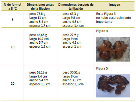 Para la fijación con formol, los mejores resultados se obtuvieron con concentración de 5 % a 5 °C. No se observó oscurecimiento ni variaciones importantes en las dimensiones de las muestras, por lo que se utilizaron las de estas condiciones para continuar con el proceso. En la Tabla 1 se muestran pruebas realizadas con diferentes concentraciones de formaldehído: