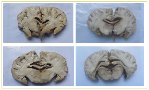 Corte y fijación: Se realizaron cortes coronales sucesivos de 1 cm de espesor. Previamente al acondicionamiento del material, dada la friabilidad del tejido nervioso, fue necesario enfriar los encéfalos a 5 °C en baño de agua (Sora, 2016) para evitar roturas al hacer la limpieza del material y los cortes. Como ha sido señalado desde las primeras publicaciones sobre la técnica por von Hagens en 1977 hasta la actualidad, es muy importante controlar el tiempo, la concentración de formol y la temperatura durante la fijación para evitar el oscurecimiento de las muestras (Jiménez Mejía e Isaza Castro, 2005; Bravo, 2006; Sora, 2016). Luego, los cerebros fueron lavados en agua corriente durante una semana para eliminar el exceso de formol en los tejidos (Guerrero et al., 2019).