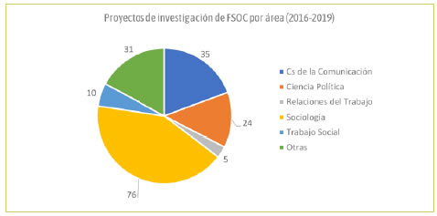 Si se analizan los proyectos según área, 76 se inscriben en Sociología (42 %), 35 en Ciencias de la Comunicación (19,3 %), 24 en Ciencia Política (13,3 %), 10 en Trabajo Social (5,5 %) y 5 en Relaciones del Trabajo (2,8 %). Luego, se encontraron 31 proyectos (17,1 %) cuya área no se corresponde con las disciplinas de las carreras de la facultad. Entre estos, un subgrupo explicita otras disciplinas o especialidades: cuatro son de Filosofía, tres de Antropología, tres de Historia, dos de Educación, uno de Ciencias del Hábitat, uno de Economía, uno de Herramientas de Análisis y uno de Psicología. Un segundo subgrupo no aplica un criterio disciplinar al momento de completar el área, al referir a un conjunto de ciencias o bien adoptar como área el tipo específico de programación científica: once refieren a Ciencias Sociales, uno a Humanidades, uno a Marginaciones Sociales (piubamas) y uno a Proyecto de Desarrollo Estratégico (pde).