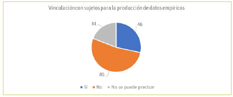 Por consiguiente, como variable de análisis, se clasificó a aquellos proyectos que enuncian en sus resúmenes la intención de realizar algún tipo de vinculación directa con sujetos sociales individuales o colectivos como parte de la estrategia general de producción de conocimiento a partir de datos empíricos. Desde la clasificación presentada, se entiende esta vinculación basada tanto en trabajo de campo cualitativo (que incluye, por ejemplo, entrevistas, observaciones, etc.) como también en formas de producción de datos cuantitativos primarios (a partir de encuestas, por ejemplo).