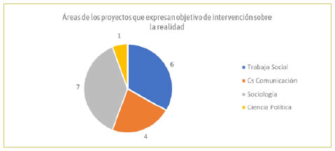Estos porcentajes deben ser ponderados en proporción al total de proyectos de cada disciplina. Cabe señalar que siete de los 76 proyectos del área de Sociología se proponen intervenir, seis de los diez proyectos de Trabajo Social, cuatro de los 35 de Ciencias de la Comunicación y uno de los veinticuatro de Ciencia Política. Representan el 19,44 %, 60 %, 11,42 % y 4,16 %, respectivamente. Lo anterior podría explicarse por las características de cada disciplina y la singularidad de las tradiciones investigativas de las distintas carreras de la facultad. Los porcentajes expresan la particularidad de los planes de estudio y los perfiles de egresados/as de esta, así como tradiciones disciplinares que, por ejemplo, ligan el Trabajo Social a una vocación de vinculación con la realidad que se expresa en la intervención y en un menor desarrollo de la investigación.