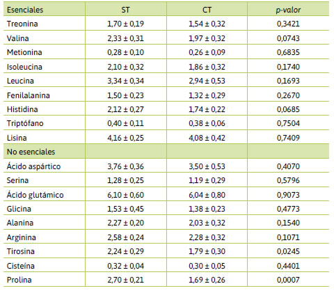 Todas las determinaciones analíticas se realizaron en el ltl. El pH se midió a las 48 h post-mortem con un pHmetro portátil (Modelo 35805-18, Oakton, Singapur). Las restantes determinaciones se efectuaron en la carne luego de los 21 días de maduración. El contenido de aminoácidos se determinó por hidrólisis directa en tubos de vidrio con ácido metanosulfónico 4 M a razón de 1 mL de ácido por cada 0,2 mg de nitrógeno de la muestra (determinado por el método de Kjeldahl). La hidrólisis se realizó a 115 °C durante 22 h. Los aminoácidos se separaron mediante cromatografía de intercambio catiónico, utilizando un analizador automático de aminoácidos Biochrom 30 (Biochrom Ltd Cambridge, Cambridgeshire, Reino Unido) con una columna de resina de intercambio catiónico de alta resolución Ultrapac (9 ± 0,5 µm de tamaño de partícula, Pharmacia Biotecnología) 200 x 4,6 mm. A continuación, los aminoácidos reaccionaron con ninhidrina, derivatización post-columna, dando compuestos coloreados que fueron determinados por espectrofotometría visible a 570 nm, excepto la prolina, que se midió a 440 nm. La identificación se realizó mediante la comparación de los tiempos de retención de los aminoácidos desconocidos con los de un perfil de estándares comerciales (23aa, marca Biochrom) que permitió la obtención de las curvas de calibrado. El análisis cuantitativo de aminoácidos se basó en el método del estándar interno empleando L-norleucina. El color superficial de la carne se evaluó utilizando un espectrofotómetro de reflectancia Minolta cm-700d (Minolta Camera Co, Osaka, Japón), con iluminante a, observador estándar de 10º y una abertura de 8 mm de diámetro. Las coordenadas L* (luminosidad); rojo-verde, a* y amarillo-azul, b* (cie, 1976) se evaluaron en la 12a costilla, después de exponer las muestras durante 30 minutos a temperatura ambiente. La terneza instrumental Warner-Bratzler (wb) se determinó a través de la cuantificación de la fuerza de cizalla sobre bifes cocidos a la altura de la costilla 12a con analizador de textura Stable Micro System ta-xt2i (Surrey, Inglaterra) y celda Warner-Bratzler de 30 kg (amsa, 1995). Se registró el promedio de lecturas de seis cilindros de 1,3 cm de diámetro. Las muestras se cocinaron en un horno convectivo (Medcenter, modelo Venticell 111, Grafelfing, Alemania) a 170 ºC hasta una temperatura interna de 71 ºC que fue monitoreada utilizando un Testo modelo 925 (Lenzkirch, Alemania). Las mermas totales por cocción se calcularon como la diferencia entre el peso de la muestra antes y después de la cocción y se expresó como porcentaje del peso inicial. La determinación de tbars (sustancias reactivas al ácido tiobarbitúrico) se realizó mediante el método de extracción con solvente y reacción del extracto con ácido 2-tiobarbitúrico (Rosmini et al., 1996). En las muestras para la evaluación sensorial, la cocción se realizó en plancha de doble contacto (a 170 ºC) hasta 71 ºC de temperatura interna. Los 10 miembros del panel fueron previamente entrenados. Se evaluó el aroma, sabor, jugosidad, presencia de tejido conectivo y off-flavor mediante un análisis descriptivo cuantitativo. Se utilizó una escala lineal no estructurada de 10 cm, con puntos extremos (1: muy débil, muy baja, inexistente, a 10: muy intenso, muy alta, fuerte presencia). Al momento de la evaluación, las muestras se cortaron en unidades de 2 cm de lado y se sirvieron calientes.