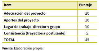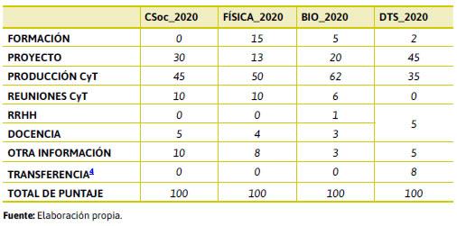 Por pedido a la Gerencia de Evaluación del conicet tuvimos acceso a los memorándums en los que cada comisión volcó sus criterios, materializados en cuatro grillas de puntajes, como se muestra en el Anexo i al final del texto2.