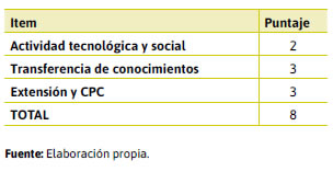 Como mostramos en las tablas 1 y 3, el peso de estas actividades sobre el total es del 8%, lo que implica ya un aumento respecto de las comisiones tradicionales incluidas en esta muestra de análisis. Además, en rigor, recuperamos para el cálculo total de puntaje de actividades de transferencia una cuarta variable que hace referencia de forma explícita a un aspecto significativo de las actividades de transferencia, como lo es la identificación explícita de aportes (en tanto resultados) que se espera que la investigación propuesta produzca. Esta variable aparece en la grilla con un valor máximo de 10 puntos (o 10% del total del puntaje).