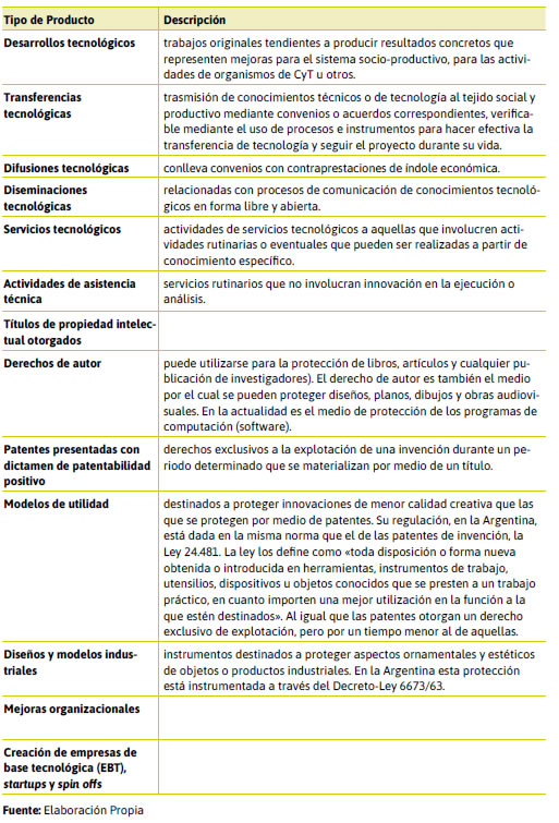 En el documento «Pautas para la evaluación de los productos y de las actividades tecnológicas» de la Gerencia de Evaluación y Planificación del conicet6 se definen una serie de actividades tecnológicas y sus productos, como se sistematiza en la Tabla 4.