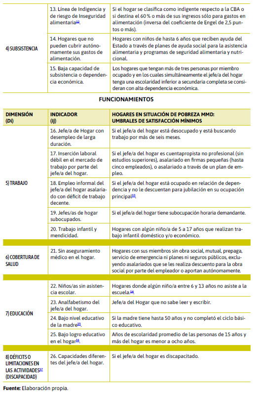 Aquí se propuso una serie de dimensiones e indicadores tentativos, con umbrales remitidos a derechos elementales a satisfacer para superar el estado de pobreza. Sin embargo estos satisfactores se pueden cambiar, excluir algunos, incluir otros, actualizar sus umbrales de satisfacción de acuerdo con las metas u objetivos de desarrollo sostenible que propone lograr el país en los próximos años, consensuando los indicadores en los que se quiere hacer énfasis desde el Estado para planificar políticas de desarrollo social.