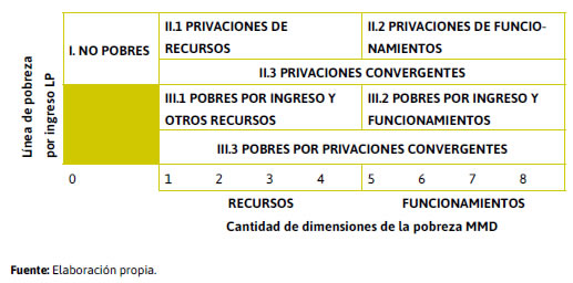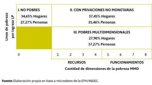 Se apostó entonces a resignificar la categoría «pobreza» desde una mirada que invita a deconstruirla tensionando con las formas tradicionales de concebirla y dimensionarla. Por eso en este trabajo se hizo como aporte una propuesta metodológica que tomara la potencialidad de la perspectiva multidimensional, integrándola (y no reemplazándola) a la oficial Línea de Pobreza por ingresos, ya que ésta se encuentra muy arraigada en el sistema estadístico nacional y a su vez está muy instalada en la sociedad argentina.