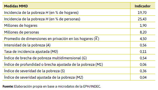 Según la incidencia ajustada, el índice en esta medición puntual dio M0=0,15. Es un índice muy relevante en mediciones en una serie de tiempo para evaluar su evolución ya que sopesa simultáneamente la incidencia de la pobreza con la intensidad de las privaciones.