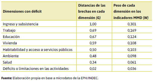También en el uso de ponderaciones unarias para fijar normativamente el peso de las dimensiones e indicadores en el constructo global de pobreza. Se aplicó esta solución por ser más apta para una medición puntual por lo que también se recomienda la consulta del trabajo completo donde se utiliza el esquema de ponderaciones relativas obtenidas por procedimientos estadísticos.