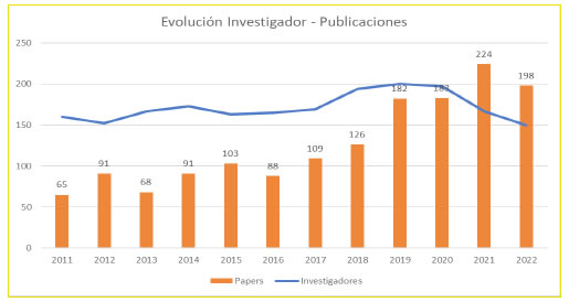 Al analizar la evolución de las publicaciones en revistas arbitradas se constató un aumento significativo en el período 2011-2022, pasando de 65 publicaciones en 2011 a un total de 224 en 2021 y 198 en 20228, a pesar incluso de una disminución en el número de investigadores en los últimos años (Figura 1).
