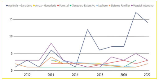 A nivel de los sistemas de producción en los que el inia organiza su agenda de investigación, se puede observar que en la mayoría se ha dado un aumento gradual y constante de la producción científica (a excepción del Sistema Familiar), si bien no todos en la misma proporción (Figura 4).