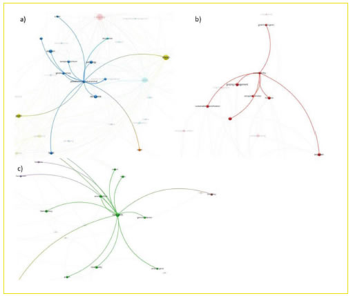 El área de sostenibilidad ambiental vinculado a la conservación de los rrnn, emisiones de gases y servicios ecosistémicos aparece en menor medida, y los conceptos relacionados al área aparecen vinculados a las temáticas de ganadería, manejo de pasturas y cultivos (especialmente arroz y soja) (Figura 6, b). Otro grupo de publicaciones, asociadas a la calidad de carne, vinculan temas de mejoramiento genético, bienestar animal y reproducción (Figura 6, c).