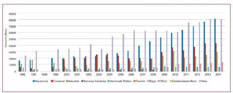 En la Figura 3 se observa claramente el predominio de usuarios pertenecientes al sector residencial que crece en forma sostenida en el período 1996-2014.