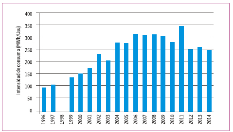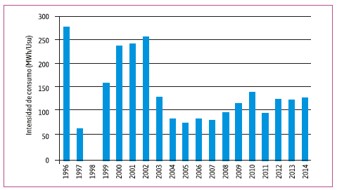 Figura 6. Variaciones en la intensidad del consumo eléctrico en el sector industrial. Período 1996-2014