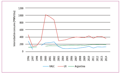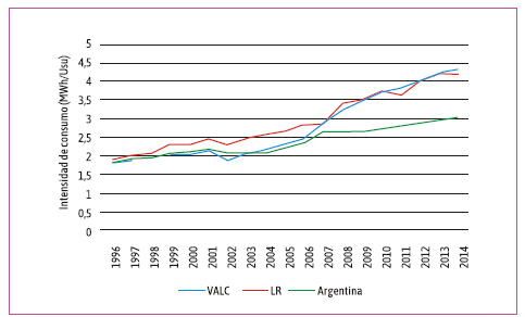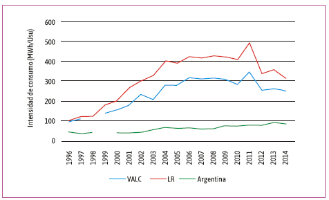 Figura 10. Variación en la intensidad de consumo eléctrico en el sector residencial en valc, lr y Argentina. Período 1996-2014