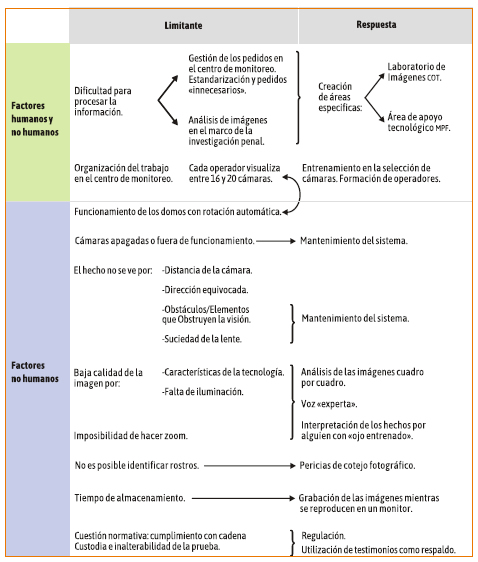 Quienes intervienen en la operatividad diaria de estos sistemas detectan y describen múltiples límites que surgen del uso de estas tecnologías, que cuestionan el argumento que entiende su uso como una panacea. El primer problema se vincula con la capacidad de procesar dichas imágenes y esto tiene, como consecuencia, un impacto en la efectividad de su uso como evidencia. Si todos coinciden en que, en función de la cantidad de pedidos, las imágenes de las cámaras se utilizan regularmente, su efectivo aporte a la identificación del delito depende de factores varios: «Te mandan 150 horas de video. Después hay que verlas y procesarlas», explican desde el Ministerio Público Fiscal de la Nación (Vicente Díaz, comunicación personal, 30/06/2017), donde existe un área de apoyo a las investigaciones penales desde la cual colaboran con las fiscalías de jurisdicción nacional y federal en el procesamiento de los registros audiovisuales de las cámaras. La disponibilidad creciente de estos registros genera trabajo adicional, en tanto las imágenes a procesar son cada vez más, y esto impacta incluso en la estructura y las tareas de las agencias públicas del sistema de justicia.