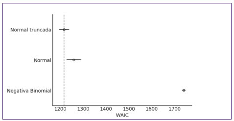 La calidad de vida desde el punto de vista de la salud intestinal se midió mediante la escala generada por el ibdq32, la cual es una variable discreta que se distribuye en el rango de 32 a 224 (en nuestra muestra, entre 80 y 224). Evaluamos el ajuste de la muestra ibdq32 a tres distribuciones: negativa binomial, normal y normal truncada (límite superior 224). Los valores del ibdq32 tiene una media de 193,1 (y un valor máximo de 224) y una desviación estándar de 24,2 (Figura 1B). Usamos waic (Watanabe, 2013) a fin de evaluar el ajuste. Encontramos que la distribución con un valor de waic inferior (y por lo tanto el mejor modelo, entre las alternativas evaluadas) es una normal truncada (Figura 2). La dimensión gastrointestinal tuvo una media de 61,3±5,2 puntos (de un máximo posible de 70), la sistémica tuvo una media de 24,8±8,8 (de un máximo posible de 35), el emocional fue el más variable, con una media de 67,4±13,3 (de un máximo posible de 84), y el dominio menos variable fue el social, cuya media fue de 32,6±3.6 (de un máximo posible de 35). Los valores de ibdq32 no mostraron diferencias relevantes respecto al género (Figura 3A). Además, no se observaron diferencias relevantes en el puntaje total del ibdq32 con respecto a la edad (Figura 3B), aunque los hombres presentaron valores más altos en la dimensión emocional (datos no mostrados).