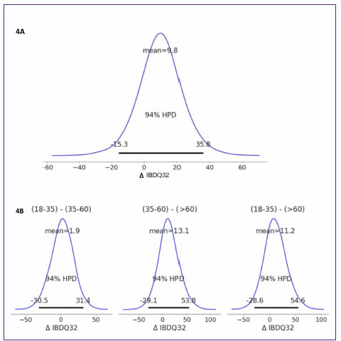 Para lograr un análisis más completo de las diferencias de valores observados en el ibdq32 de la muestra, se estimó la distribución del ibdq32 en varones y se restó de la misma la distribución del ibdq32 en mujeres, observando (Figura 4A) que las diferencias toman mayormente valores positivos, como lo indica su intervalo hpd (highest posterior density, es decir, el intervalo más corto posible que contiene un determinado porcentaje del total de la densidad de probabilidad, un concepto bayesiano análogo al intervalo de confianza frecuentista). Es decir, el conjunto de hombres tiene en promedio mayor ibdq32 que el de mujeres, y el valor de la media de las diferencias (mean) es de 9,8. El mismo razonamiento se debe usar para la Figura 4B, donde están involucrados los diferentes grupos etarios, 18 a 35, 35 a 60 y > 60. De estas figuras se puede observar que la mejor calidad de vida se localiza el segmento etario medio (de 35 a 60).