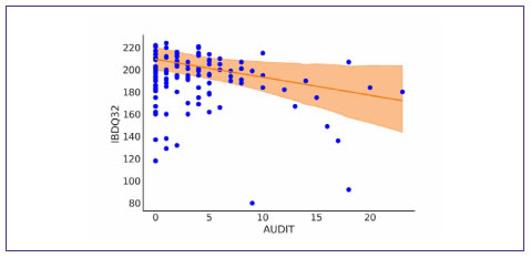 Al analizar las relaciones entre las diferentes variables consideradas en este trabajo, se observó una relación inversa existente entre valores de audit e ibdq32 (Figuras 5 y 6), indicando que a mayor consumo de alcohol se produce un empeoramiento de la calidad de vida desde el punto de vista de la salud intestinal. Esta es la relación que se esperaba dada la cantidad de observaciones realizadas en humanos (Rajendram y Preedy, 2005) y en modelos animales (Purohit et al., 2008) en las que se demuestra que el alcohol produce daños en la barrera epitelial intestinal. Además, no se observan relaciones de importancia, tanto en el acp, las correlaciones individuales o las regresiones múltiples, que involucren a los alimentos andinos, u otros grupos de alimentos en el bienestar intestinal. Los valores que mejor explican esta distribución son los índices de audit, la edad, el sexo, el índice de masa corporal, y si consume alimentos andinos (quínoa, amaranto y papa andina).