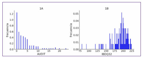 Para analizar el patrón de consumo de alcohol de las personas que participaron en el estudio se utilizó la encuesta audit, en la que los valores más elevados indican un patrón consistente con daños producidos por el excesivo consumo de alcohol y posible adicción al mismo. audit es una variable discreta que va entre 0 y 24 y su distribución puede ser aproximada por una distribución cero-inflada negativa binomial (datos no mostrados). Los puntajes obtenidos para la encuesta audit muestran el 30,6 % con un valor de cero, con una media de 3,69 puntos y una varianza de 1,10 (Figura 1A). El punto de corte desde el cual el consumo se considera riesgoso y puede generar problemas de salud, psicológicos o sociales, es un puntaje de audit de 8 o más (Babor, T. et al., 2001). En nuestra muestra, eso representa el 13,6 % (19 casos). La media en las mujeres es más baja que en hombres (2,9 y 4,7, respectivamente). El consumo de alcohol disminuye con la edad; el mayor consumo se da en la franja etaria de 18 a 35 años en varones y en mujeres.