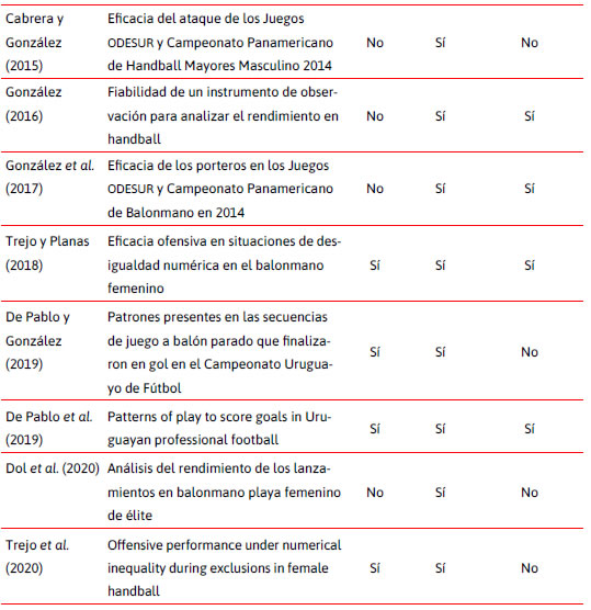 La metodología observacional aplicada a la investigación deportiva ha presentado un amplio desarrollo a nivel internacional en los últimos años (Anguera y Hernández Mendo, 2013; Ávila, Chirosa, Ureña, Lozano y Ulloa, 2018; Sarmento et al., 2014). Específicamente en Uruguay son numerosos los trabajos realizados y publicados que estudian aspectos técnicos y tácticos de los deportes colectivos (handball, básquetbol, fútbol, etc.) en diferentes ámbitos. Aunque se pueden encontrar algunos estudios notacionales con anterioridad (Botejara y Puñales, 2001), en el año 2010 se desarrolló en el Instituto Universitario Asociación Cristiana de Jóvenes (iuacj) el primer proyecto de estudio del rendimiento en handball que utilizaba específicamente esta metodología. Desde 2014 esta línea de investigación observacional en los deportes colectivos ha sido ampliamente extendida con la formación del grupo de investigación Entrenamiento Deportivo y Rendimiento del iuacj. Un hito importante supuso la presentación en Montevideo de los primeros trabajos finales del Máster en Rendimiento Deportivo: Tecnificación y Alto Nivel (retan) desarrollado por el Instituto Nacional de Educación Física de Cataluña (inefc) en las instalaciones del iuacj en 2015, donde algunas de las investigaciones utilizaron esta metodología. Por otra parte, dentro del Instituto Superior de Educación Física (isef), su inclusión en las propuestas de investigación ha ido aumentando de forma relevante, y es una línea de trabajo fructífera dentro del Grupo de Investigación de Deporte y Rendimiento desde su formación en el año 2017.