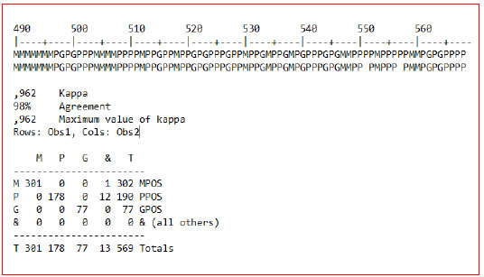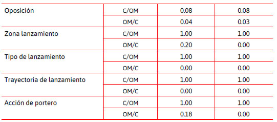 Tabla 6. Resultados del cálculo de concordancia intraobservador e interobservadores mediante el índice de Kappa en el criterio «oposición» con tres observadores (ObsA, ObsB y ObsC) y dos períodos de observación (1 y 2). Proceso de cálculo de la fiabilidad en (Cabrera y González, 2015)