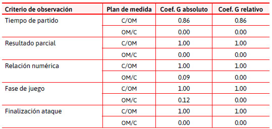 La teoría de la generalizabilidad ha sido utilizada para determinar la fiabilidad de un instrumento observacional para analizar la eficacia del ataque en handball (González, 2016). En este trabajo, se realizó un estudio de generalizabilidad combinando los distintos criterios del instrumento (c), considerados como facetas, con las facetas observadores (o) y momentos (m). Para ello, tres observadores analizaron por separado y de forma independiente dos partidos de competiciones panamericanas. Además, cada uno de los observadores realizó el registro en dos momentos distintos con un intervalo de un mes. A partir de los datos se calcularon los coeficientes de generalización para los planes de medida c/om y om/c (Tabla 7). En este caso, para el plan de medida c/om los valores fueron próximos a uno. Por el contrario, en om/c se acercan a cero. Esto indica que la variabilidad total se explica a través de la faceta criterio (c), con escasa influencia de los observadores (o) y los momentos (m). De nuevo la excepción aparece en el criterio «oposición», donde los bajos coeficientes de generalizabilidad delatan grandes diferencias entre los observadores.