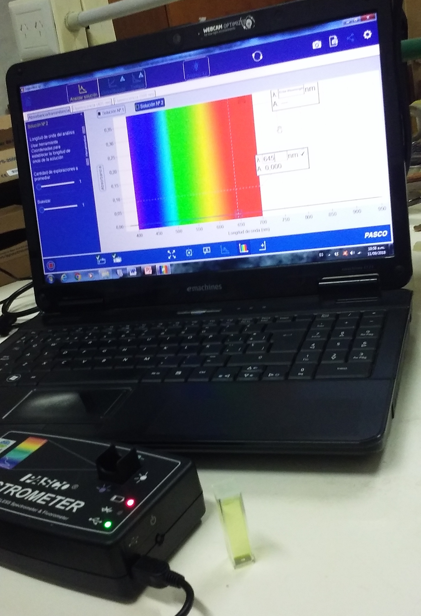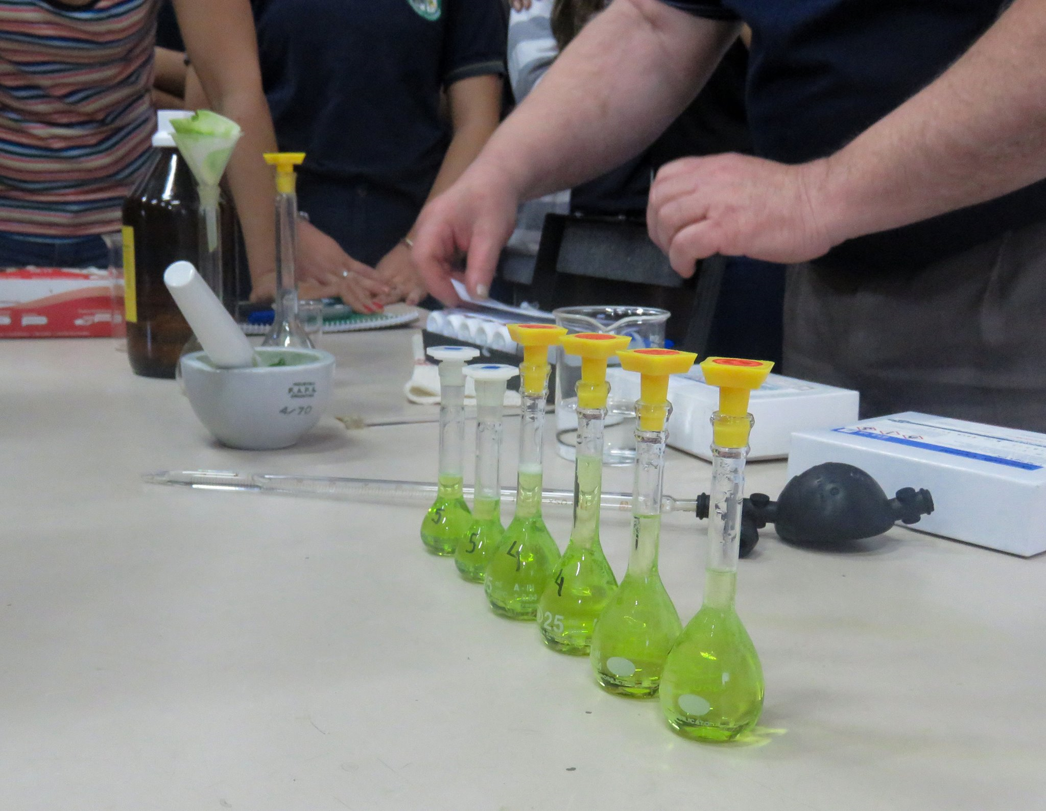 La actividad se denominó «Los pigmentos verdes y su relación con la eutrofización» y consistió en determinar un parámetro indicativo de la contaminación ambiental cuantificando la clorofila en cuerpos de agua superficiales, con la finalidad de estimar su eutrofización. La eutrofización ocurre debido al aumento de nutrientes del agua, lo que provoca que las algas crezcan en gran cantidad, causando la turbidez. Este parámetro aporta información sobre la calidad del agua y permite evaluar si es adecuada para la función en la cual se la necesita emplear. Para llevar a cabo esta actividad, se dividió la clase en dos partes: una etapa inicial en la cual se hizo una introducción y exposición de los conceptos teóricos necesarios para la comprensión de la parte experimental mediante herramientas de Power Point y folletos explicativos, y una segunda etapa en la cual se llevó a cabo la parte práctica propiamente dicha. Para ello, a una cantidad específica de hojas de espinaca se le extrajo la clorofila con acetona con la ayuda de un proceso de mortereo continuo de 10 minutos. A esa solución obtenida se le realizaron diluciones seriadas desde 1/25 a 1/2 para lograr preparar 5 muestras con diferentes concentraciones de clorofila. A estas muestras se les realizaron las lecturas espectrofotométricas (absorbancias) de los pigmentos verdes a la longitud de onda de 664 nm. El instrumento utilizado para esto fue un espectrómetro portátil Wireless Spectrometer PS 2600 marca PASCO acoplado a una laptop o celular. Las muestras presentaron distintos grados de turbidez relacionado con el contenido de clorofila correspondiente, siendo aquella muestra más turbia la que presentó mayor valor de absorbancia. A partir de estos valores de absorbancia se calcularon las concentraciones de clorofila utilizando las ecuaciones de Jeffrey y Humphrey (1975) y se determinaron dentro de qué categoría trófica (Ultraoligotrófica, Oligotrófica, Mesotrófica, Eutrófica, Hipertrófica) correspondería cada muestra (OCDE, 1982; como se cita en Ryding, et al., 1992).