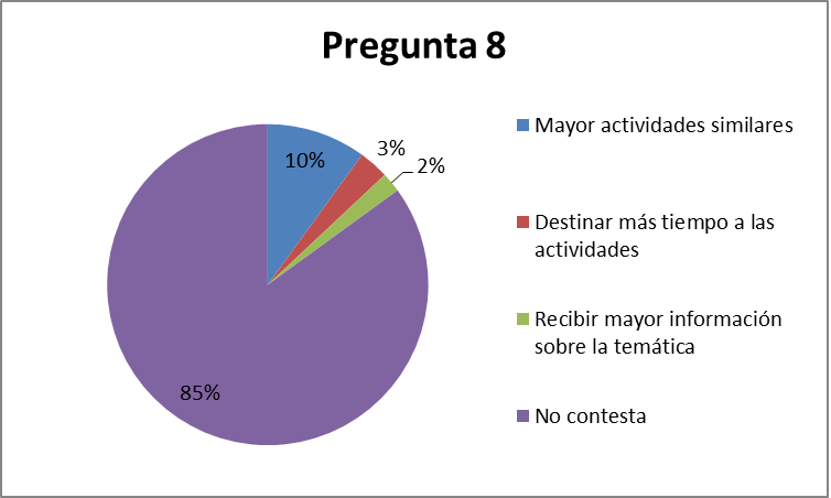 En el caso de las respuestas a la pregunta N.° 8 «Sugerencias (Desarrollar)», las respuestas graficadas en la Figura 4 fueron: (1) Brindarles más actividades similares a las desarrolladas, (2) Destinar más tiempo al desarrollo de las actividades y (3) Recibir mayor información sobre la temática. En este caso, la opción «No contesta» quedó en primer lugar de frecuencia con un 85 % del total de respuestas.